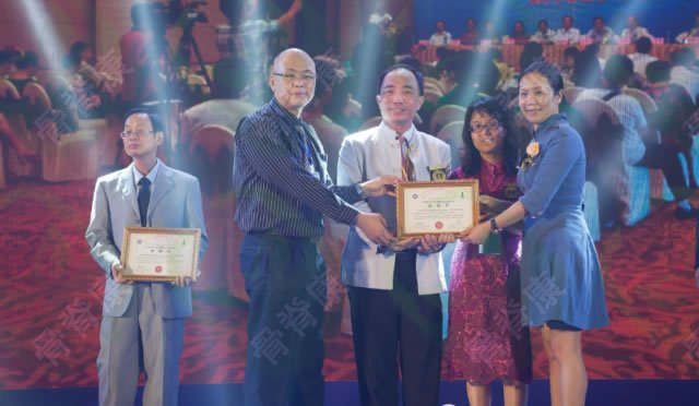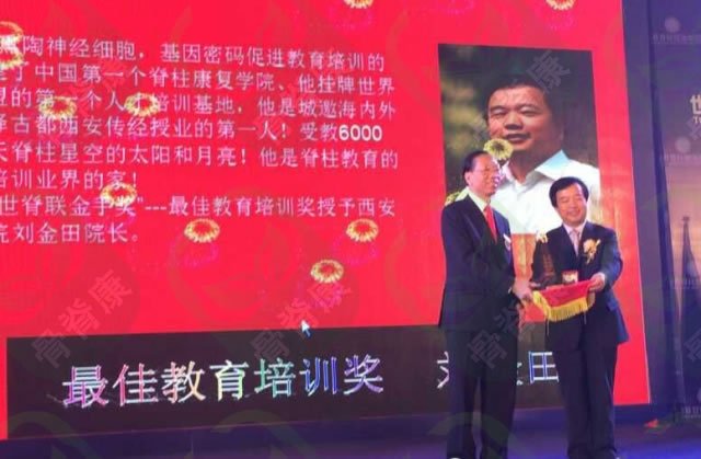 最佳教育培训奖——刘金田(世脊联副主席、西安脊柱康复学院院长),世脊联主席陈忠良先生为其颁奖