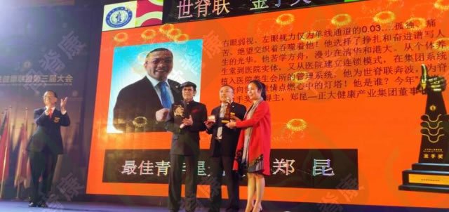 最佳青年星光奖——郑昆(世界脊柱健康联盟理事、正大健康产业集团董事长、中国脊柱养生专家),吴帆(世脊联理事长美)、黄锦波(国首位华裔市长、医学博士)为其颁奖