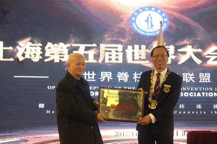 福建南少林骨伤流派、林如高骨伤手法传承人、林如高之子林子顺教授向世界脊柱健康联盟陈忠良主席赠送牌匾:整脊圣手