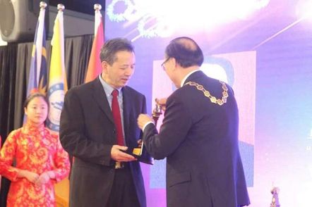 世界脊柱健康联盟陈忠良主席向澳大利亚林子强教授颁发世界脊柱健康联盟最高学术荣誉奖项【金手奖】奖杯。