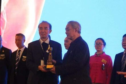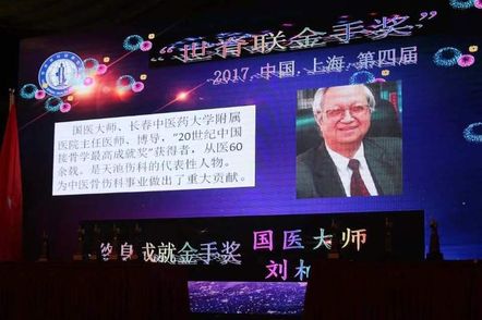 世界脊柱健康联盟陈忠良主席向国医大师刘柏龄教授颁发世界脊柱健康联盟最高学术荣誉奖项【金手奖】奖杯。