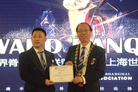 世界脊柱健康联盟陈忠良主席向第五届世界脊柱健康联盟大会主席邱万光颁发世界脊柱健康联盟最高学术荣誉奖项【金手奖】青年星光奖奖杯。