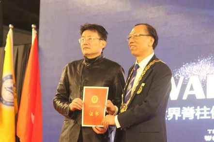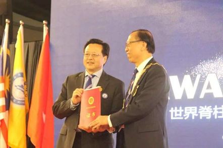 世界脊柱健康联盟向上海中医骨伤研究所杜宁教授颁发荣誉聘书。