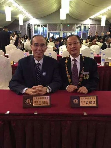 世界脊柱健康联盟常务副主席袁健强博士与世界中医药联合会王和鸣教授在大会合影。