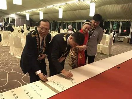 世界脊柱健康联盟陈忠良主席、第五届世界脊柱健康联盟大会邱万光主席、广州中医药大学罗雅霞处长、广州医疗协会会长苏志强在长卷上签名。